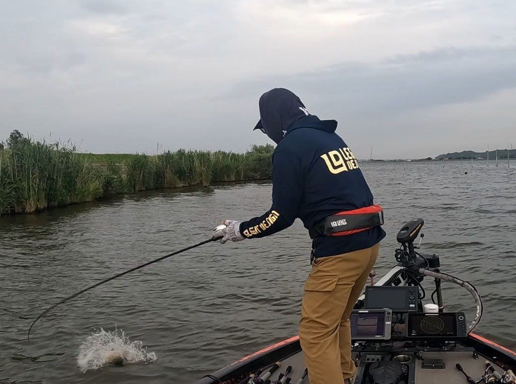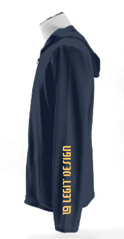 ネイビーのベースカラーに左胸、背面、左袖口に、クリームイエローでLEGIT DESIGNロゴをプリント。